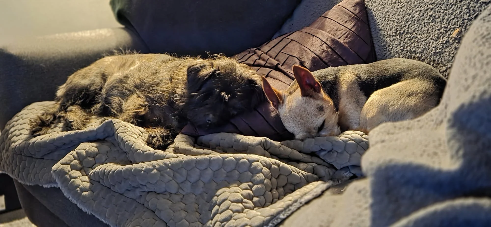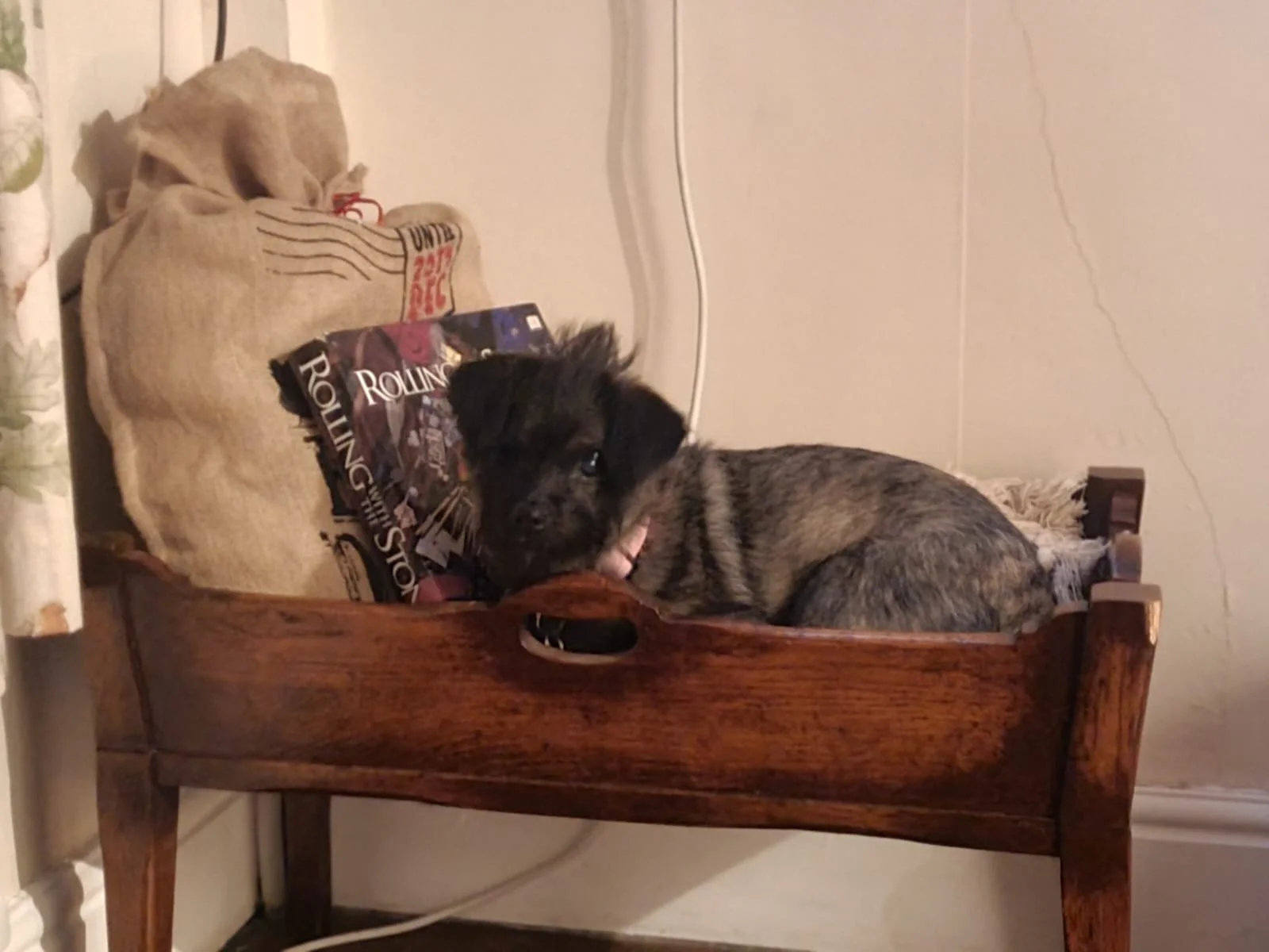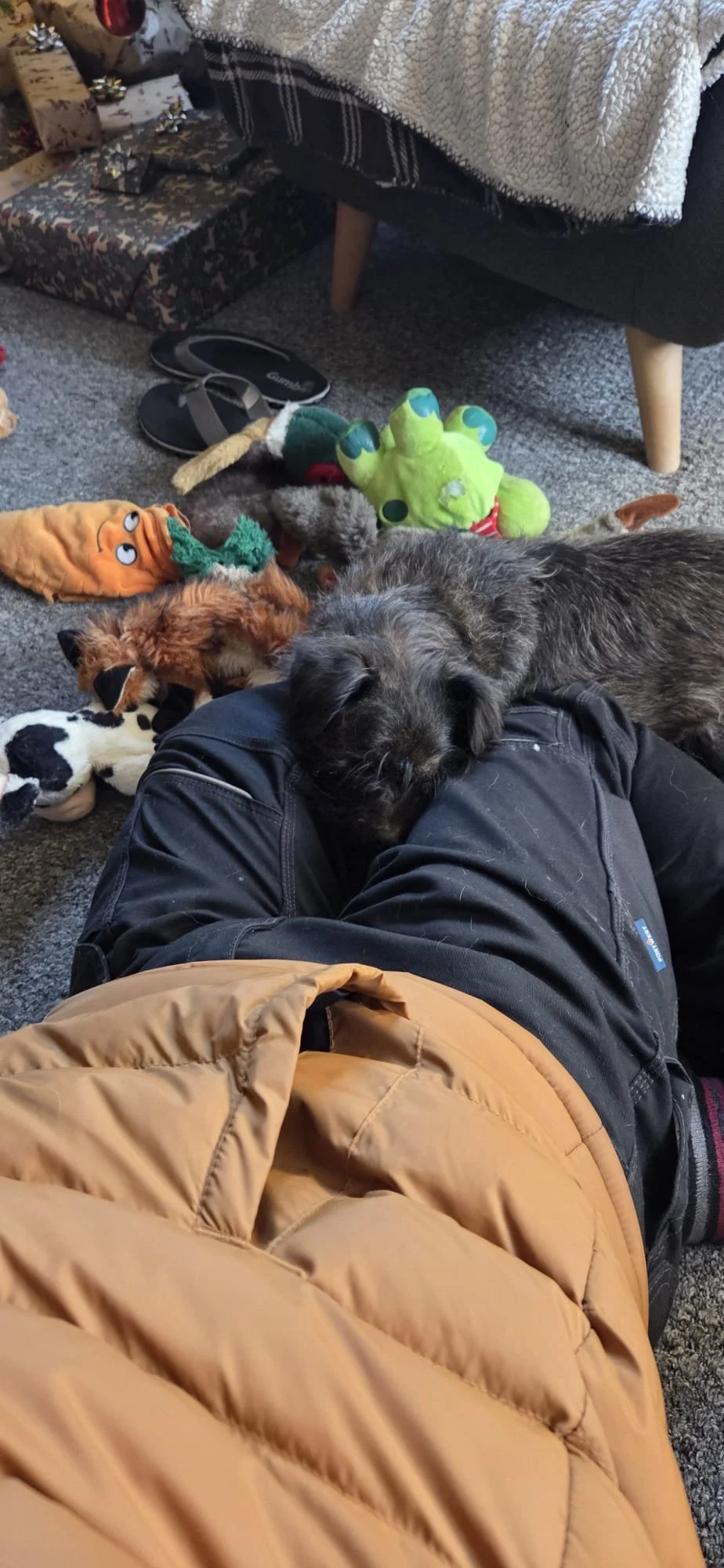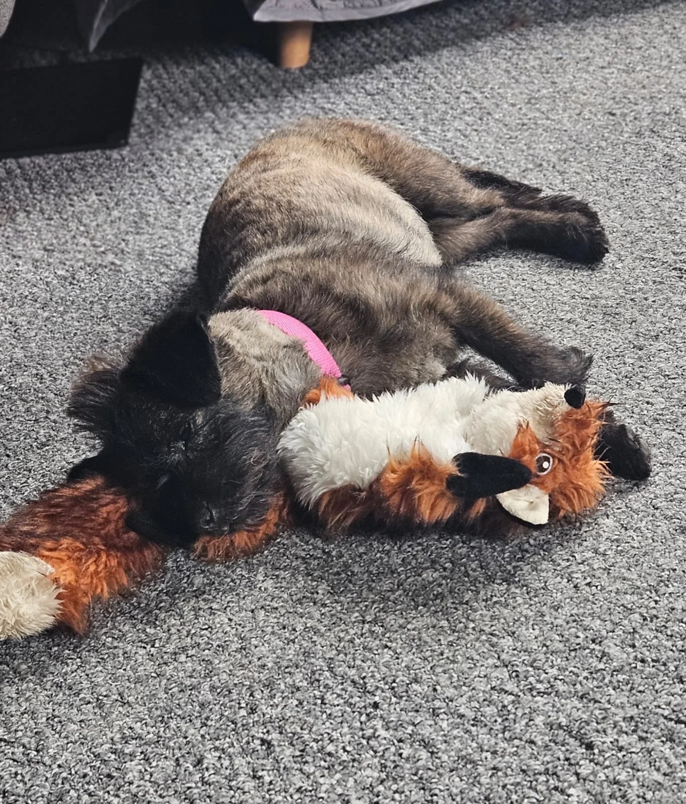 Sally no longer experiences separation anxiety and can be left happily for up to four hours. She absolutely loves toys and likes to lay them all out on the floor before deciding which one to play with!